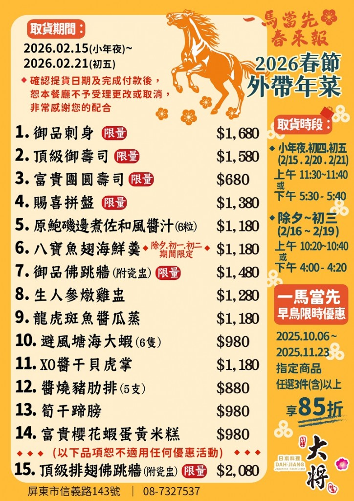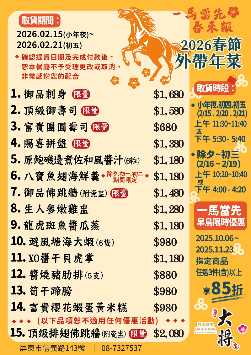亦備有精緻豐盛的外帶年菜組合,讓您在家也能輕鬆享用宴席級的豪華御料理。
