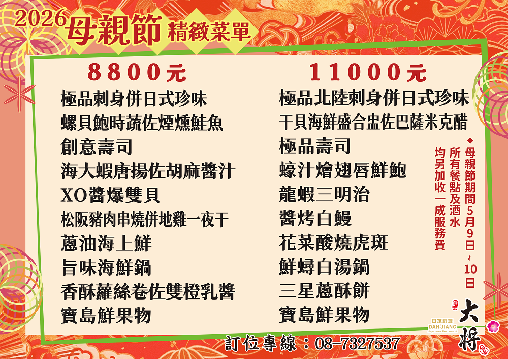 一年一度的母親節又到了,感謝媽媽的辛勞就來大將享受一頓精緻的美味吧!